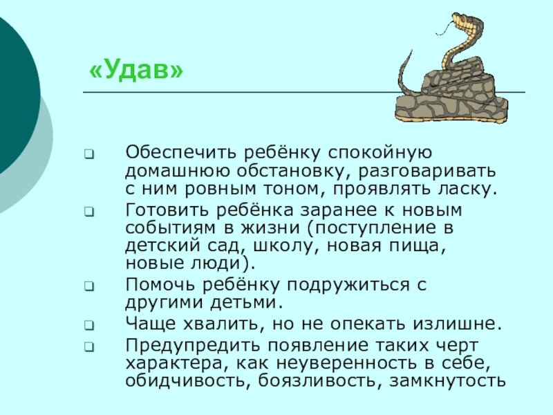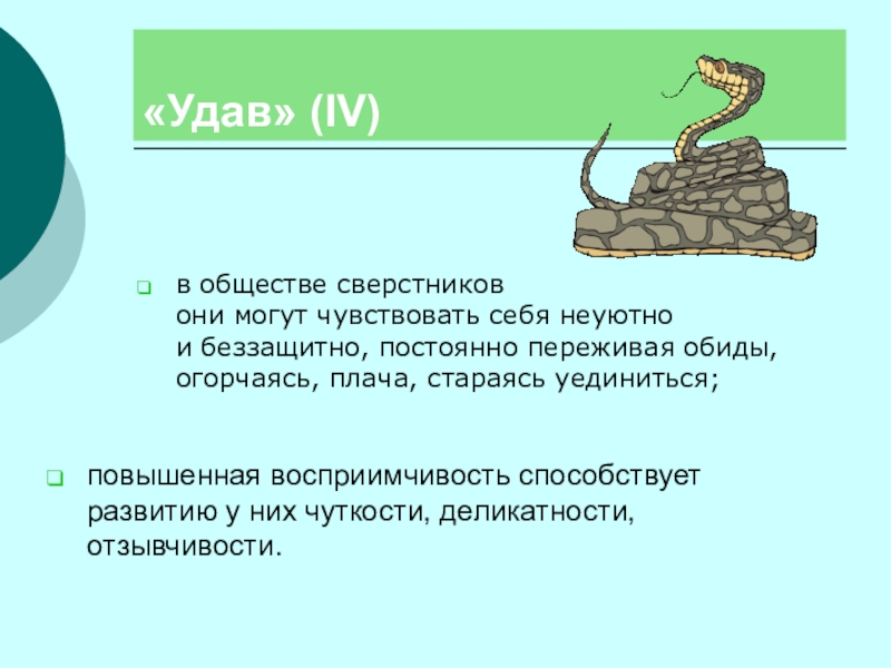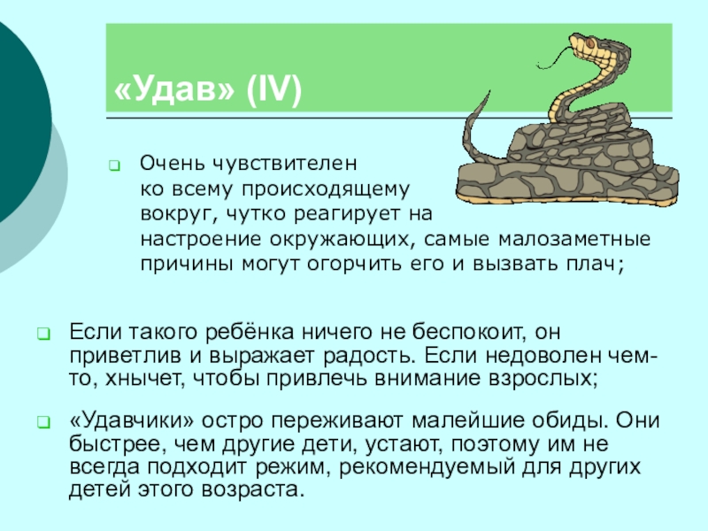 «Удавчики» остро переживают малейшие обиды. Они быстрее, чем другие дети, устают, поэтому им не всегда подходит режим, рекомендуемый для других детей этого возраста.