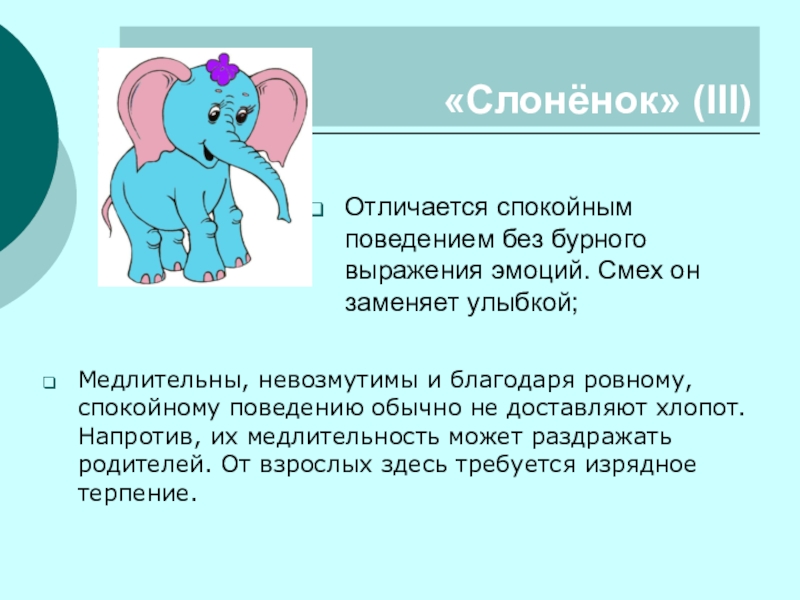 Отличается спокойным поведением без бурного выражения эмоций. Смех он заменяет улыбкой;