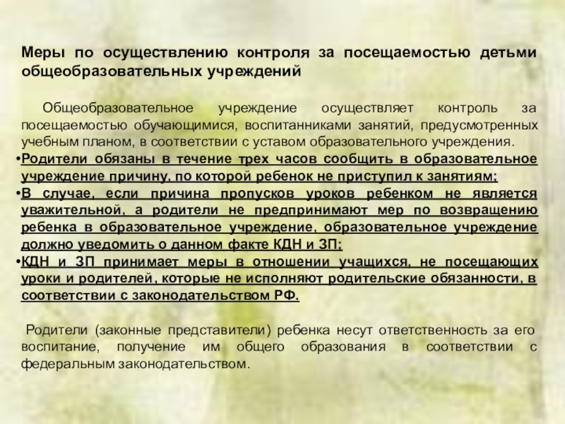 Слайд 21Меры по осуществлению контроля за посещаемостью детьми общеобразовательных учреждений