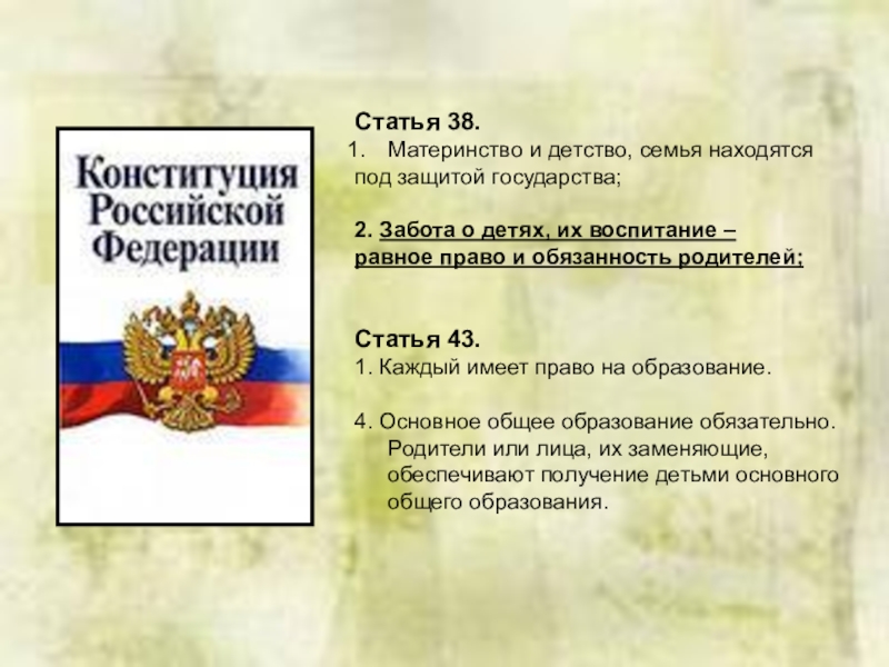 Слайд 13Статья 63. Права и обязанности родителей по воспитанию и образованию детей