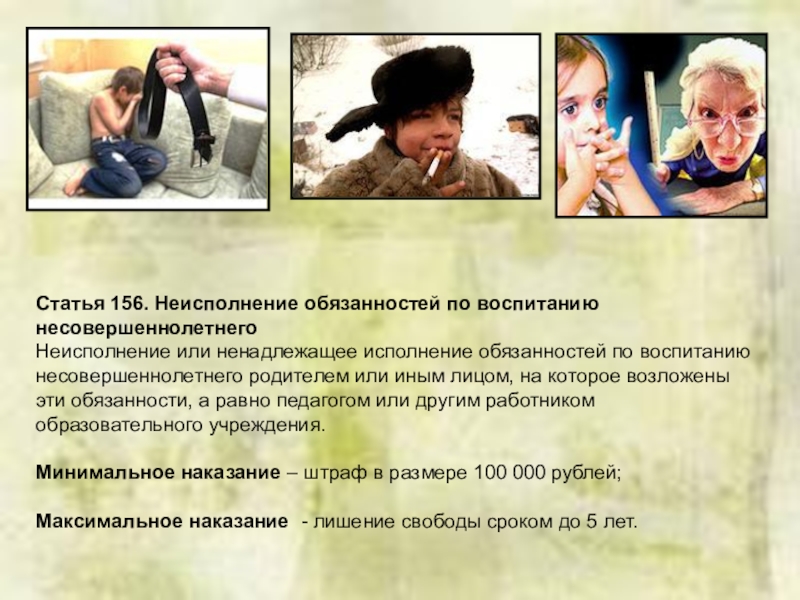 Слайд 18Статья 156. Неисполнение обязанностей по воспитанию несовершеннолетнего