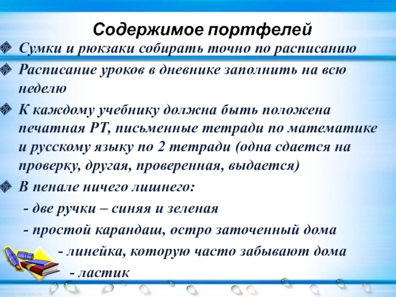 К каждому учебнику должна быть положена печатная РТ, письменные тетради по математике и русскому языку по 2 тетради (одна сдается на проверку, другая, проверенная, выдается)