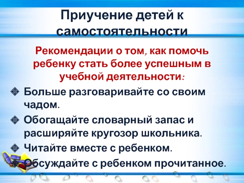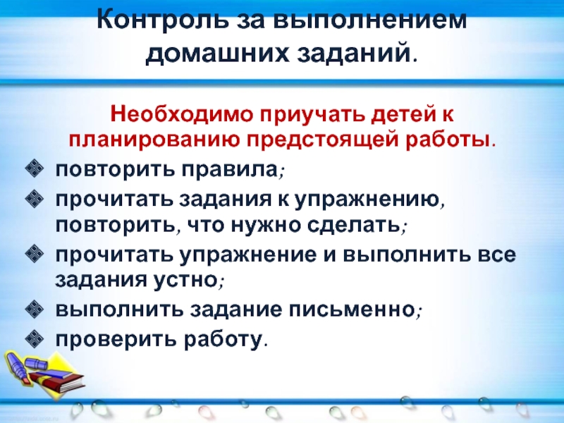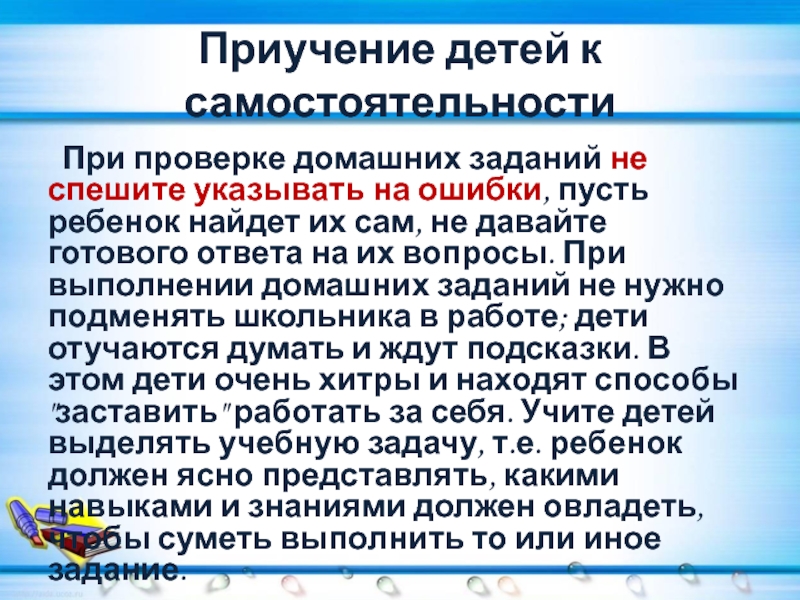 на ошибки, пусть ребенок найдет их сам, не давайте готового ответа на их вопросы. При выполнении домашних заданий не нужно подменять школьника в работе; дети отучаются думать и ждут подсказки. В этом дети очень хитры и находят способы "заставить" работать за себя. Учите детей выделять учебную задачу, т.е. ребенок должен ясно представлять, какими навыками и знаниями должен овладеть, чтобы суметь выполнить то или иное задание.