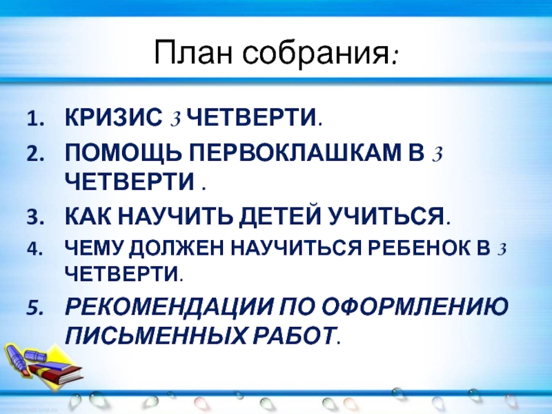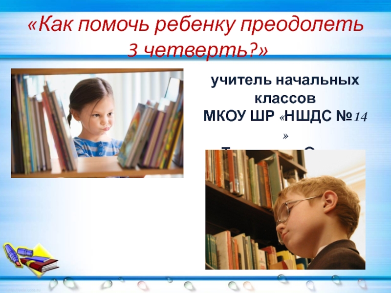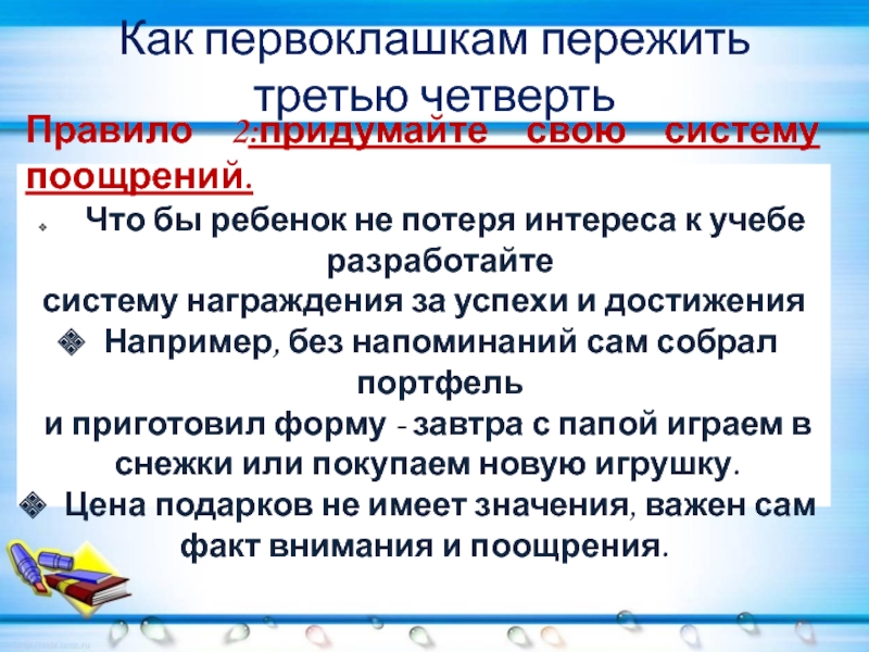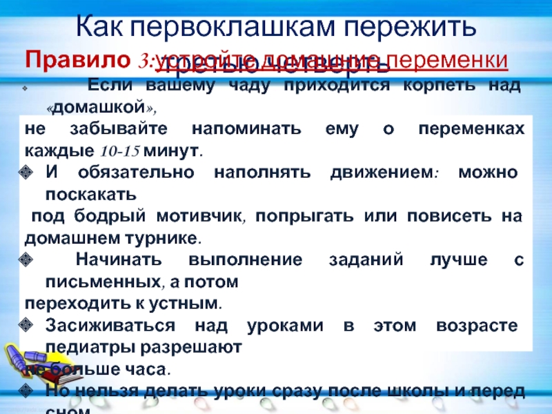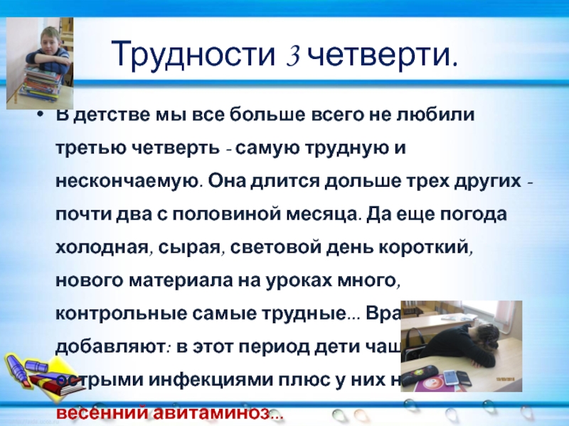 четверть - самую трудную и нескончаемую. Она длится дольше трех других - почти два с половиной месяца. Да еще погода холодная, сырая, световой день короткий, нового материала на уроках много, контрольные самые трудные... Врачи добавляют: в этот период дети чаще болеют острыми инфекциями плюс у них начинается весенний авитаминоз...