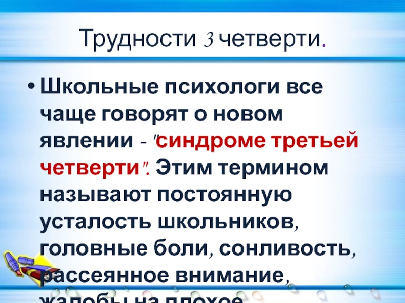 "синдроме третьей четверти". Этим термином называют постоянную усталость школьников, головные боли, сонливость, рассеянное внимание, жалобы на плохое самочувствие.