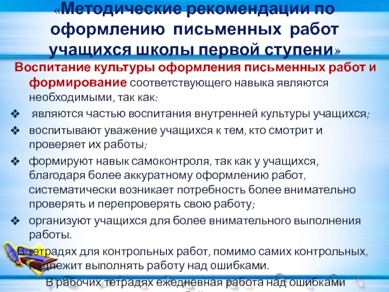 Слайд 18«Методические рекомендации по оформлению письменных работ учащихся школы первой ступени»