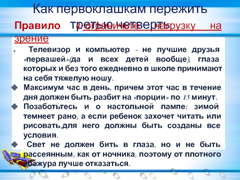 компьютер - не лучшие друзья «первашей»(да и всех детей вообще), глаза которых и без того ежедневно в школе принимают на себя тяжелую ношу.