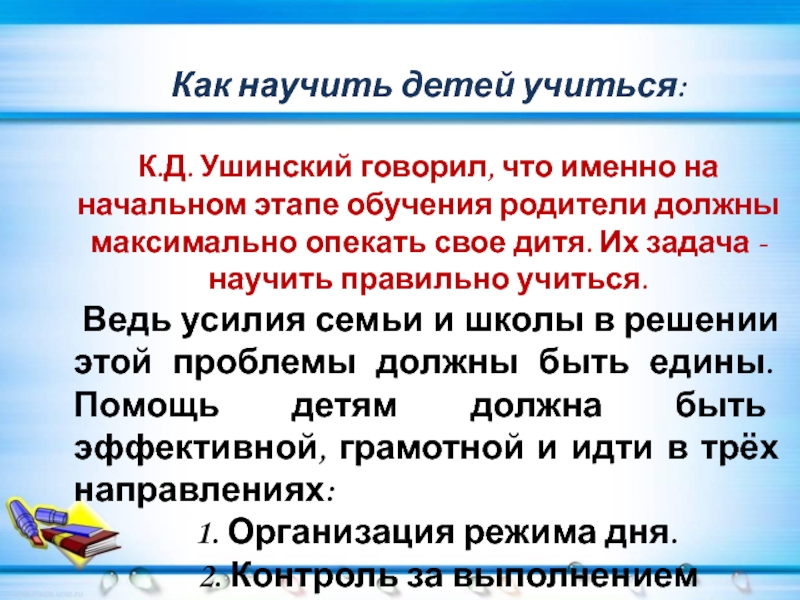 этапе обучения родители должны максимально опекать свое дитя. Их задача - научить правильно учиться.