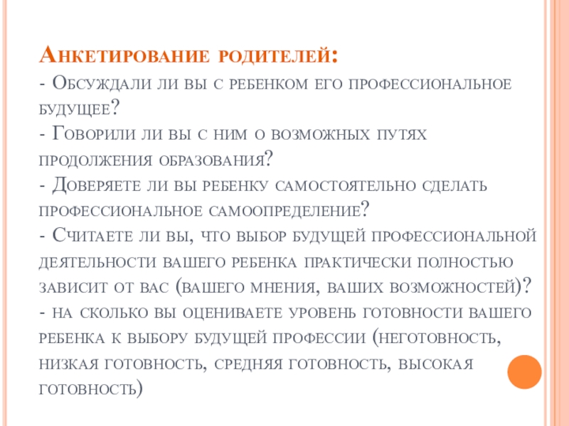 - на сколько вы оцениваете уровень готовности вашего ребенка к выбору будущей профессии (неготовность, низкая готовность, средняя готовность, высокая готовность)