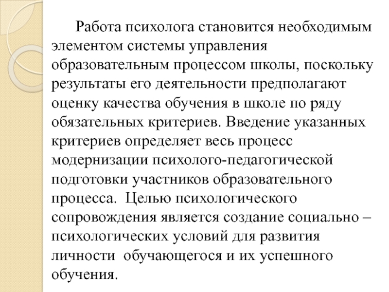 Работа психолога становится необходимым элементом системы управления образовательным процессом школы, поскольку результаты