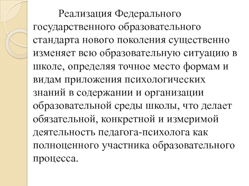нового поколения существенно изменяет всю образовательную ситуацию в школе, определяя точное место формам и видам приложения психологических знаний в содержании и организации образовательной среды школы, что делает обязательной, конкретной и измеримой деятельность педагога-психолога как полноценного участника образовательного процесса.