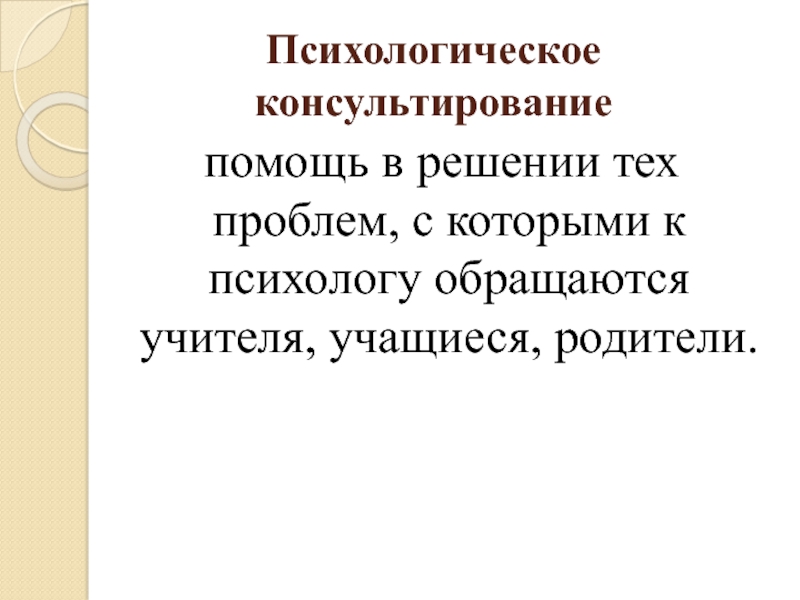 Психологическое консультирование помощь в решении тех проблем, с которыми к психологу обращаются учителя, учащиеся, родители.