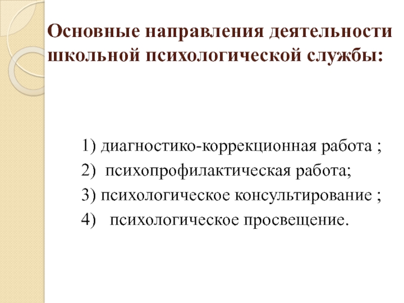 Основные направления деятельности школьной психологической службы:      1) диагностико-коррекционная работа ;