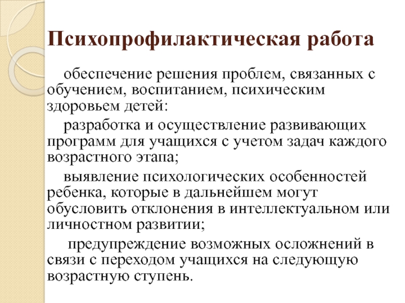 Психопрофилактическая работа    обеспечение решения проблем, связанных с обучением, воспитанием, психическим здоровьем детей: