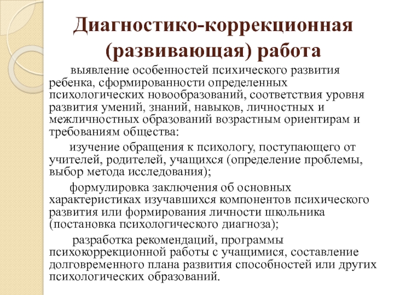 Диагностико-коррекционная (развивающая) работа      выявление особенностей психического развития ребенка, сформированности определенных психологических новообразований,