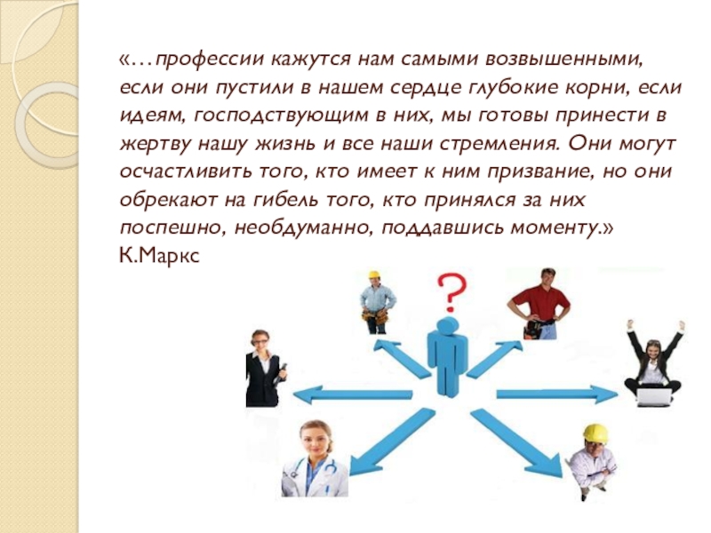 «…профессии кажутся нам самыми возвышенными, если они пустили в нашем сердце глубокие корни, если идеям, господствующим в них, мы готовы принести в жертву нашу жизнь и все наши стремления. Они могут осчастливить того, кто имеет к