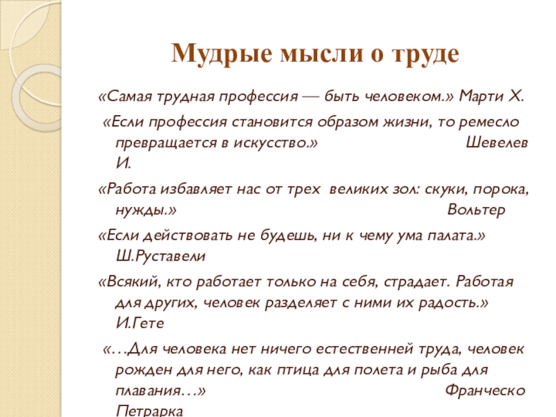 Мудрые мысли о труде«Самая трудная профессия — быть человеком.» Марти Х. «Если профессия становится образом жизни, то ремесло