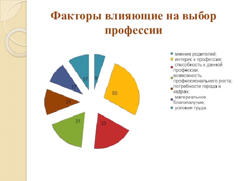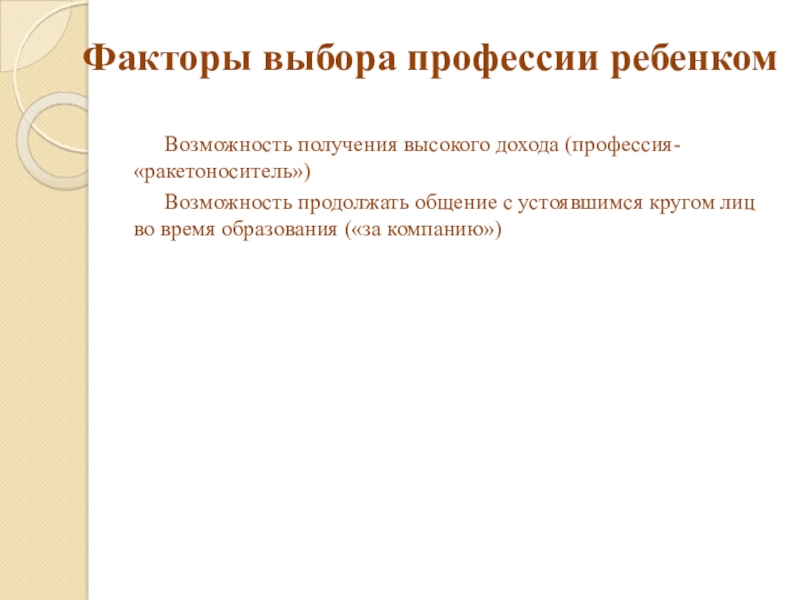 Факторы выбора профессии ребенкомВозможность получения высокого дохода (профессия-        «ракетоноситель»)Возможность продолжать