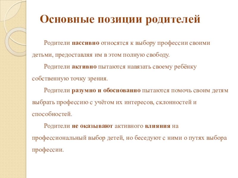 Основные позиции родителейРодители пассивно относятся к выбору профессии своими детьми, предоставляя им в этом полную свободу.Родители активно