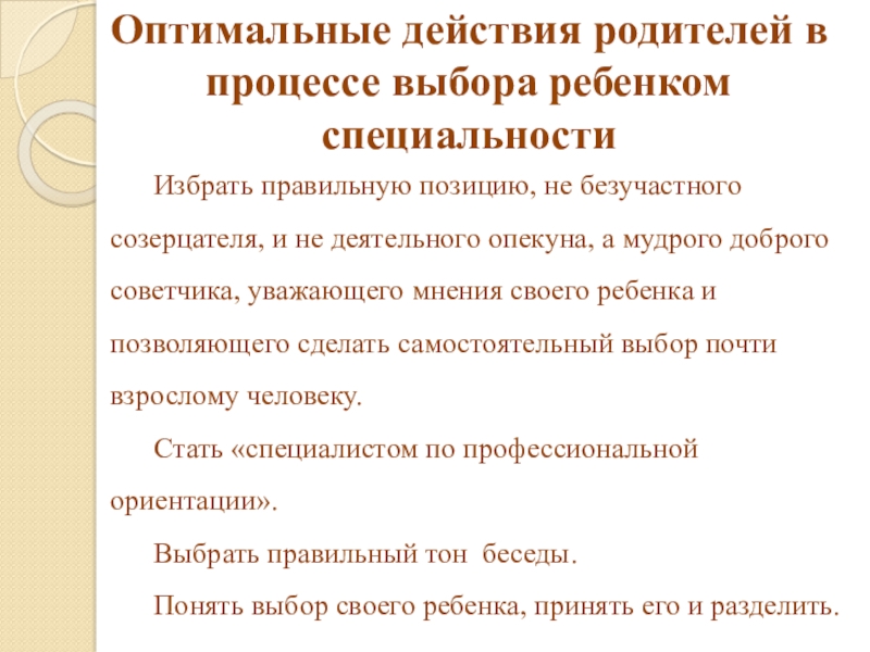 Слайд 10Оптимальные действия родителей в процессе выбора ребенком специальности