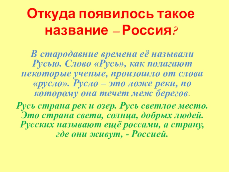 Слово «Русь», как полагают некоторые ученые, произошло от слова «русло». Русло – это ложе реки, по которому она течет меж берегов.