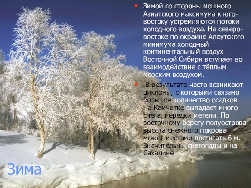 В результате часто возникают циклоны, с которыми связано большое количество осадков. На Камчатке выпадает много снега, нередки метели. По восточному берегу полуострова высота снежного покрова может местами достигать 6 м. Значительны снегопады и на Сахалине.
