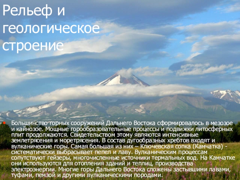 и кайнозое. Мощные горообразовательные процессы и подвижки литосферных плит продолжаются. Свидетельством этому являются интенсивные землетрясения и моретрясения. В состав дугообразных хребтов входят и вулканические горы. Самая большая из них – Ключевская сопка (Камчатка) - систематически выбрасывает пепел и лаву. Вулканическим процессам сопутствуют гейзеры, многочисленные источники термальных вод. На Камчатке они используются для отопления зданий и теплиц, производства электроэнергии. Многие горы Дальнего Востока сложены застывшими лавами, туфами, пемзой и другими вулканическими породами.