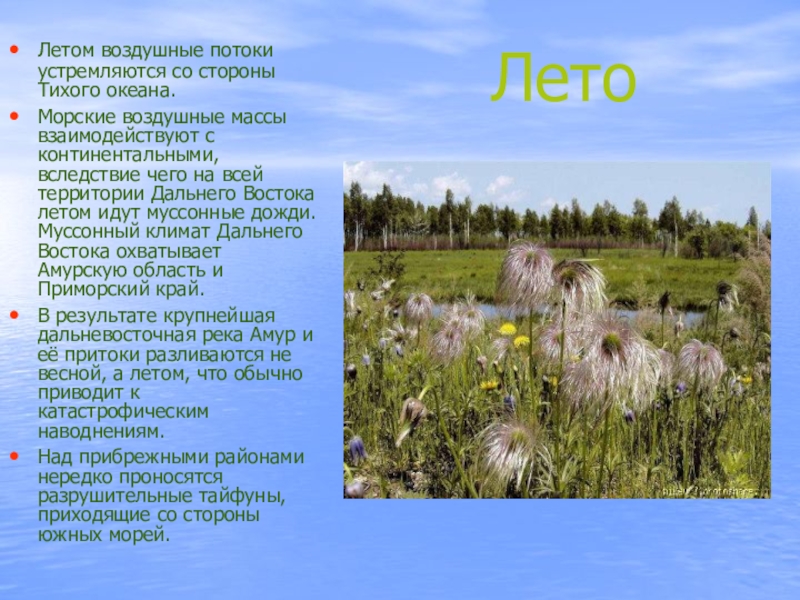 взаимодействуют с континентальными, вследствие чего на всей территории Дальнего Востока летом идут муссонные дожди. Муссонный климат Дальнего Востока охватывает Амурскую область и Приморский край.