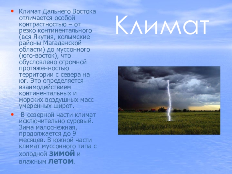 Климат Дальнего Востока отличается особой контрастностью – от резко континентального (вся
