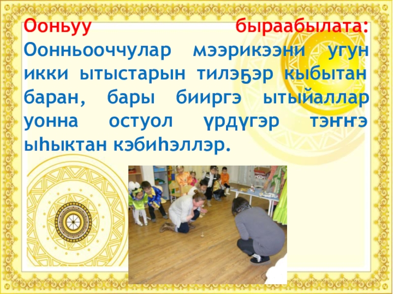 Слайд 4Ооньуу быраабылата: Оонньооччулар мээрикээни угун икки ытыстарын тилэҕэр кыбытан баран, бары