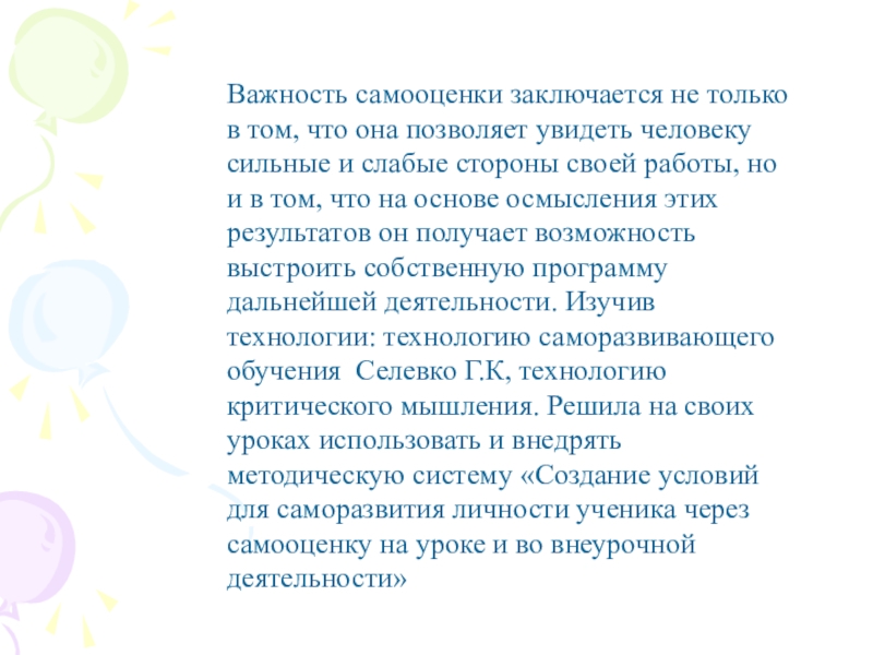 человеку сильные и слабые стороны своей работы, но и в том, что на основе осмысления этих результатов он получает возможность выстроить собственную программу дальнейшей деятельности. Изучив технологии: технологию саморазвивающего обучения Селевко Г.К, технологию критического мышления. Решила на своих уроках использовать и внедрять методическую систему «Создание условий для саморазвития личности ученика через самооценку на уроке и во внеурочной деятельности»
