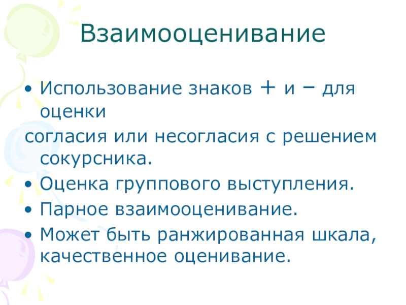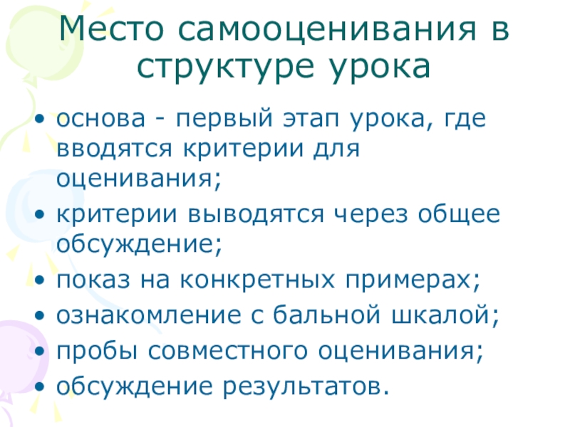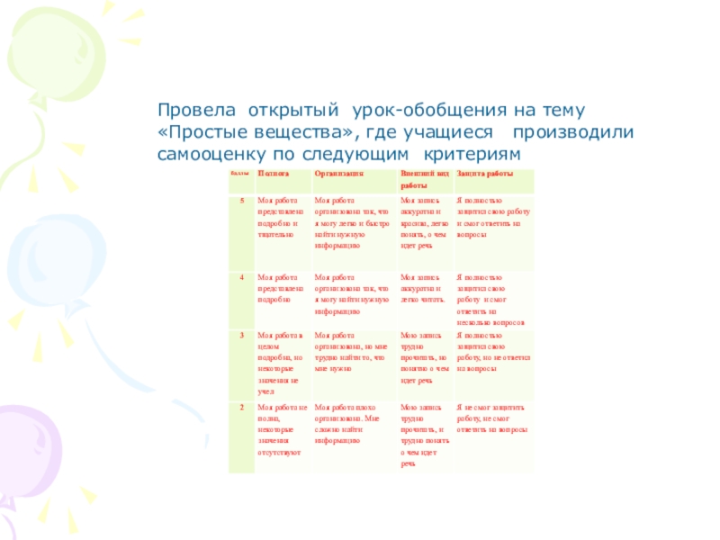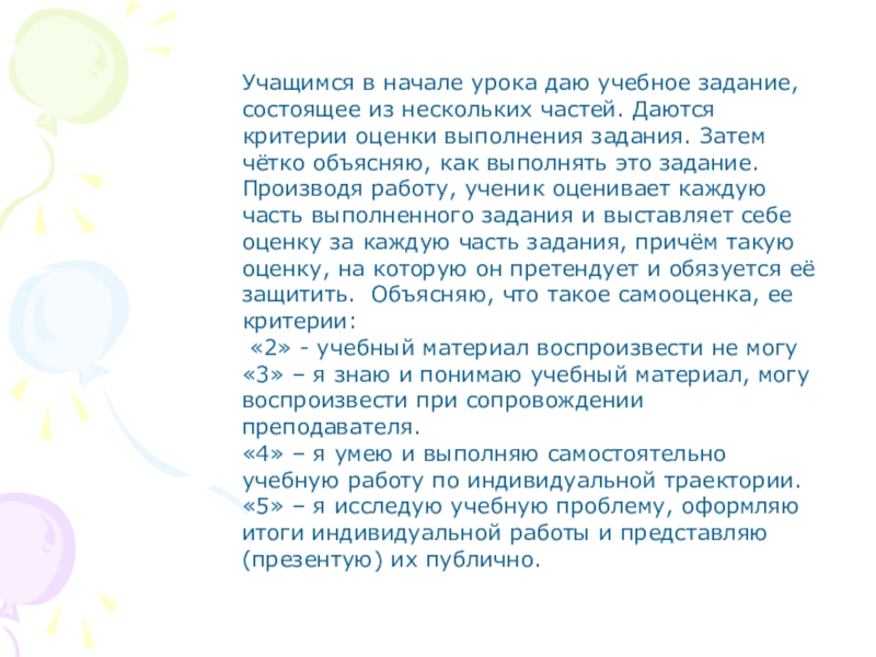 Даются критерии оценки выполнения задания. Затем чётко объясняю, как выполнять это задание. Производя работу, ученик оценивает каждую часть выполненного задания и выставляет себе оценку за каждую часть задания, причём такую оценку, на которую он претендует и обязуется её защитить. Объясняю, что такое самооценка, ее критерии:
