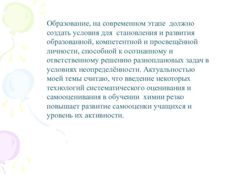 образованной, компетентной и просвещённой личности, способной к осознанному и ответственному решению разноплановых задач в условиях неопределённости. Актуальностью моей темы считаю, что введение некоторых технологий систематического оценивания и самооценивания в обучении химии резко повышает развитие самооценки учащихся и уровень их активности.