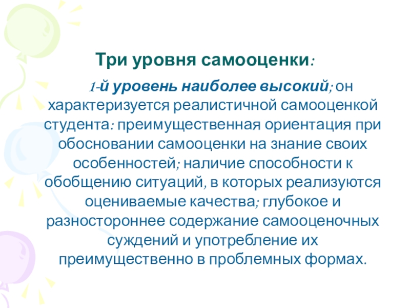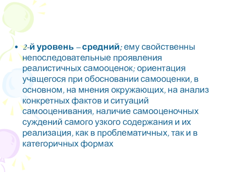 2-й уровень – средний; ему свойственны непоследовательные проявления реалистичных самооценок; ориентация