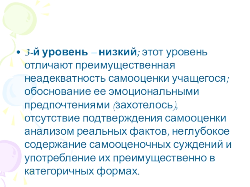3-й уровень – низкий; этот уровень отличают преимущественная неадекватность самооценки учащегося;
