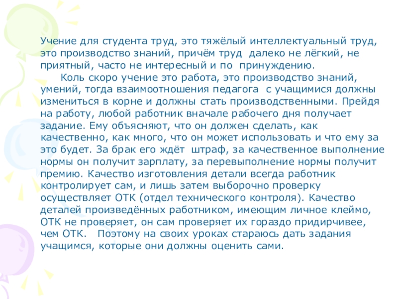 Коль скоро учение это работа, это производство знаний, умений, тогда взаимоотношения педагога с учащимися должны измениться в корне и должны стать производственными. Прейдя на работу, любой работник вначале рабочего дня получает задание. Ему объясняют, что он должен сделать, как качественно, как много, что он может использовать и что ему за это будет. За брак его ждёт штраф, за качественное выполнение нормы он получит зарплату, за перевыполнение нормы получит премию. Качество изготовления детали всегда работник контролирует сам, и лишь затем выборочно проверку осуществляет ОТК (отдел технического контроля). Качество деталей произведённых работником, имеющим личное клеймо, ОТК не проверяет, он сам проверяет их гораздо придирчивее, чем ОТК. Поэтому на своих уроках стараюсь дать задания учащимся, которые они должны оценить сами.