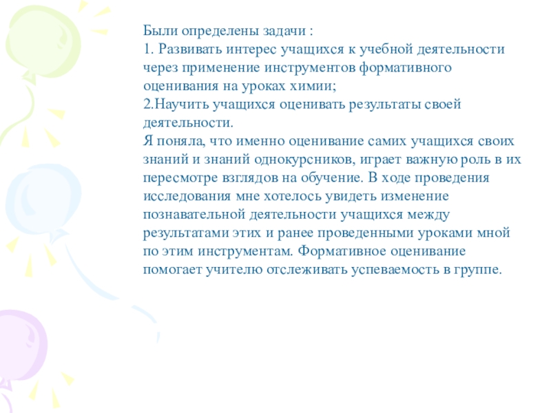 Я поняла, что именно оценивание самих учащихся своих знаний и знаний однокурсников, играет важную роль в их пересмотре взглядов на обучение. В ходе проведения исследования мне хотелось увидеть изменение познавательной деятельности учащихся между результатами этих и ранее проведенными уроками мной по этим инструментам. Формативное оценивание помогает учителю отслеживать успеваемость в группе.