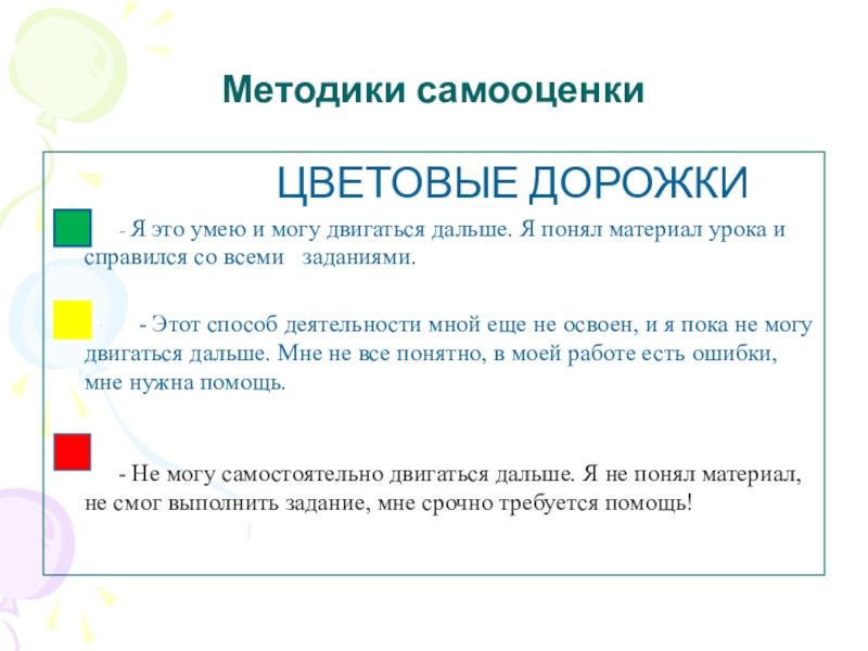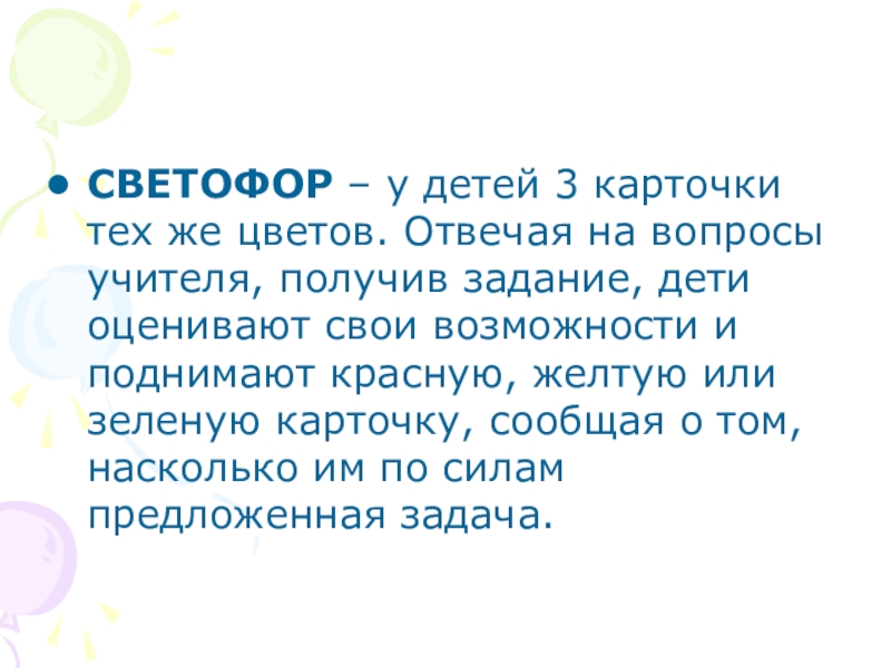 вопросы учителя, получив задание, дети оценивают свои возможности и поднимают красную, желтую или зеленую карточку, сообщая о том, насколько им по силам предложенная задача.