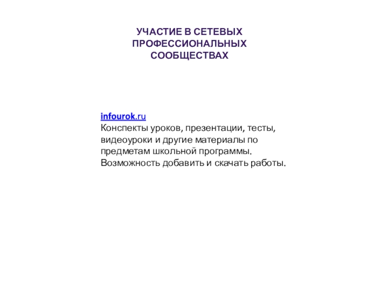 Участие в сетевых профессиональных сообществахinfourok.ruКонспекты уроков, презентации, тесты, видеоуроки и другие материалы по предметам школьной программы. Возможность добавить