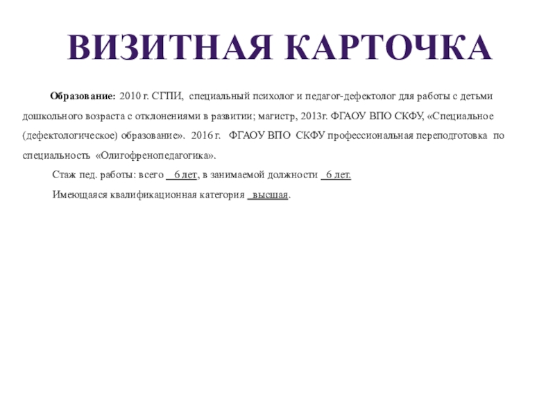 Визитная карточкаОбразование: 2010 г. СГПИ, специальный психолог и педагог-дефектолог для работы с детьми дошкольного возраста с отклонениями