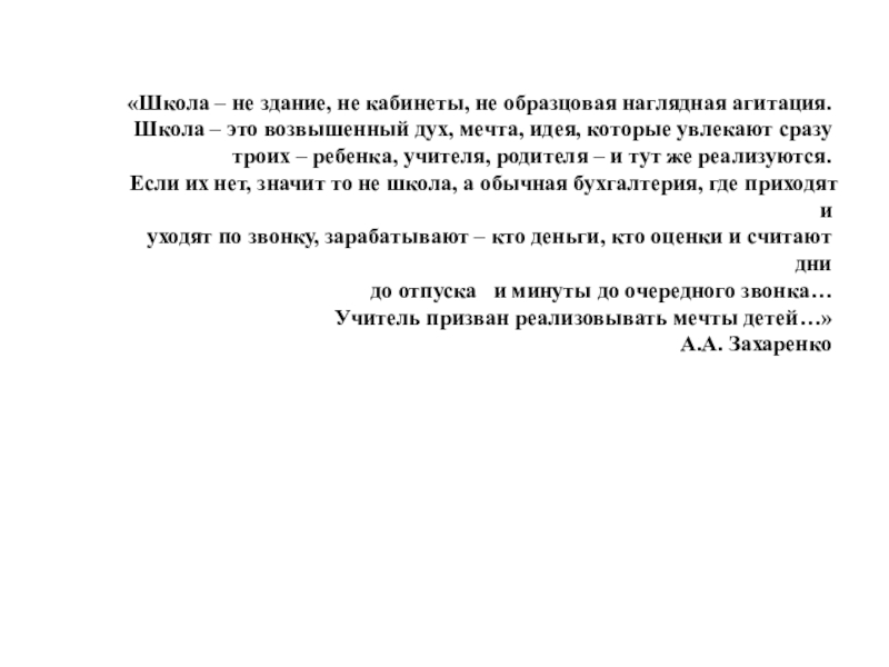 «Школа – не здание, не кабинеты, не образцовая наглядная агитация. Школа – это возвышенный дух, мечта, идея, которые увлекают сразу