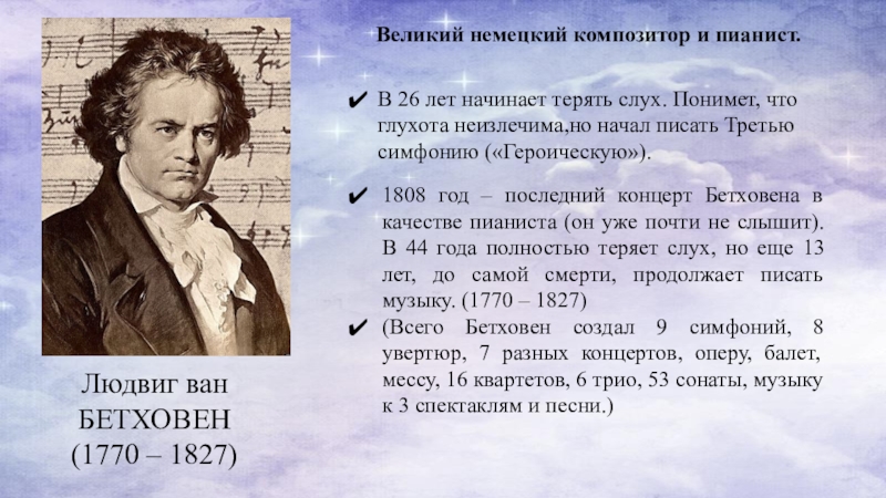 1808 год – последний концерт Бетховена в качестве пианиста (он уже почти не слышит). В 44 года полностью теряет слух, но еще 13 лет, до самой смерти, продолжает писать музыку. (1770 – 1827)