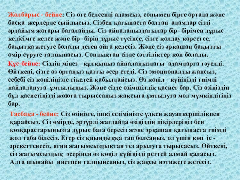 Құс-бейне: Сіздің мінез - құлқыңыз айналаңыздағы адамдарға тәуелді. Өйткені, сізге өз ортаңыз қатты әсер етеді. Сіз эмоционалды жансыз, себебі сіз көңіліңізге тікелей қабылдайсыз. Өз көңіл - күйіңізді тиімді пайдалануға ұмтылыңыз. Және сізде өзімшілдік қасиет бар. Сіз өзіңіздің бұл қасиетіңізді жоюға тырыссаңыз жақсыға ұмтылуға мол мүмкіндігіңіз бар.