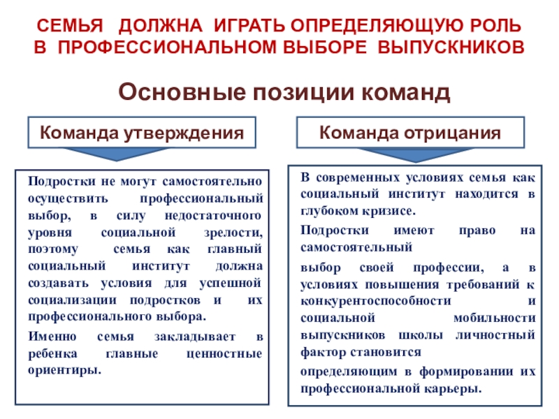 Подростки не могут самостоятельно осуществить профессиональный выбор, в силу недостаточного уровня социальной зрелости, поэтому семья как главный социальный институт должна создавать условия для успешной социализации подростков и их профессионального выбора.