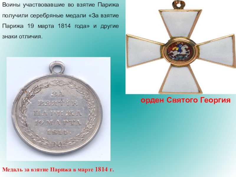 Слайд 21Медаль за взятие Парижа в марте 1814 г.