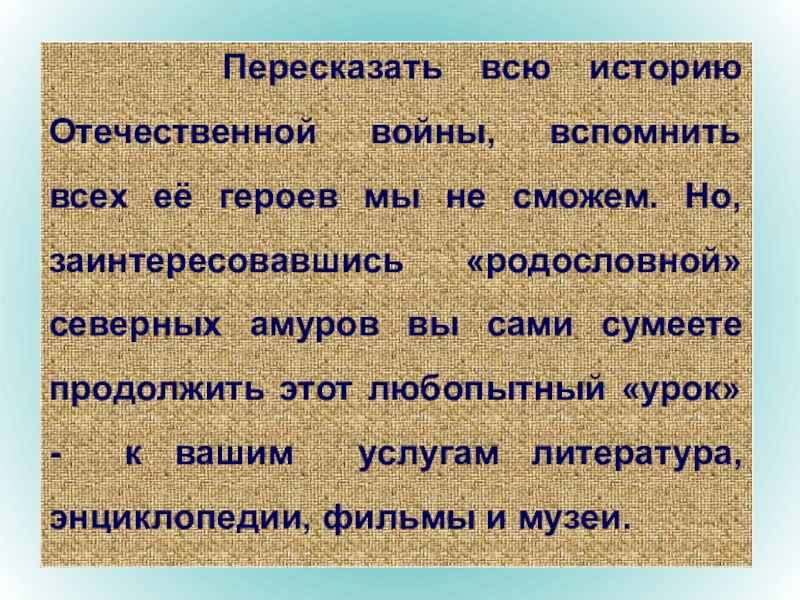 героев мы не сможем. Но, заинтересовавшись «родословной» северных амуров вы сами сумеете продолжить этот любопытный «урок» - к вашим услугам литература, энциклопедии, фильмы и музеи.