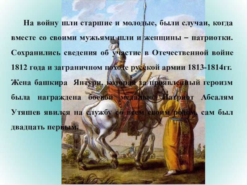 когда вместе со своими мужьями шли и женщины – патриотки. Сохранились сведения об участие в Отечественной войне 1812 года и заграничном походе русской армии 1813-1814гг. Жена башкира Янтури, которая за проявленный героизм была награждена боевой медалью. Патриот Абсалям Утяшев явился на службу со всем своим родом, сам был двадцать первым.
