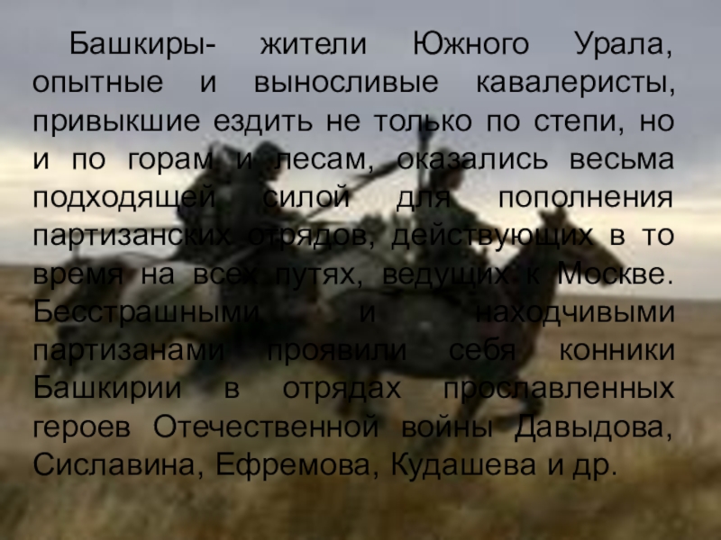 только по степи, но и по горам и лесам, оказались весьма подходящей силой для пополнения партизанских отрядов, действующих в то время на всех путях, ведущих к Москве. Бесстрашными и находчивыми партизанами проявили себя конники Башкирии в отрядах прославленных героев Отечественной войны Давыдова, Сиславина, Ефремова, Кудашева и др.