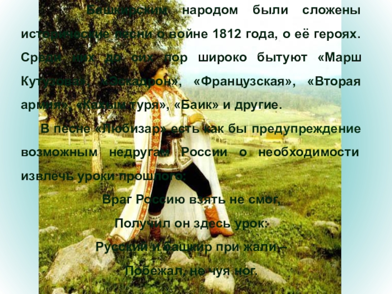 Слайд 11 Башкирским народом были сложены исторические песни о войне