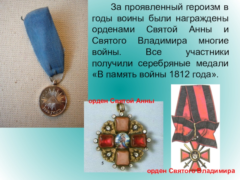 орденами Святой Анны и Святого Владимира многие войны. Все участники получили серебряные медали «В память войны 1812 года».